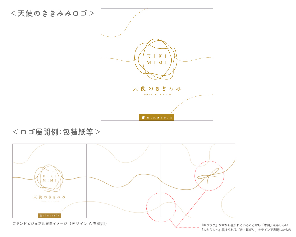 愛媛県産、特別栽培された高級きくらげ「天使のききみみ」のロゴです。栄養価の高さ、品質の良い食材の強みを喜んでいただける、健康や美容の感度の高い女性をターゲットにネーミング、ロゴを作らせていただきました。