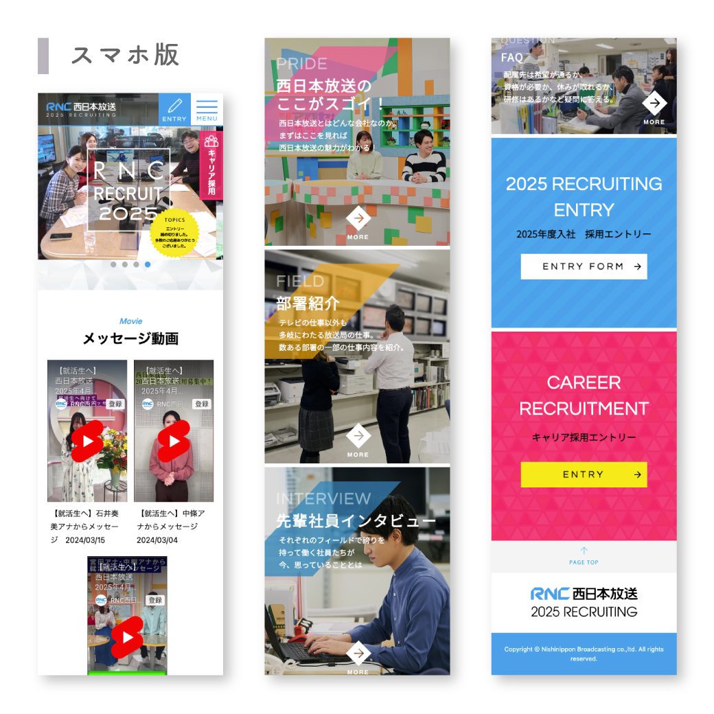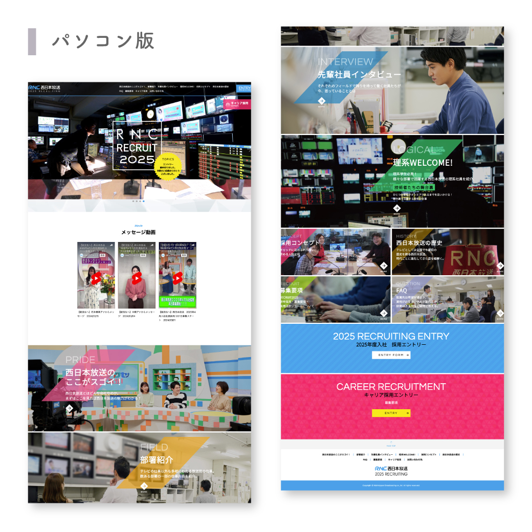 今回、採用ページをご提案するにあたり、西日本放送様には特に募りたい職種が明確にございました。そこで、ターゲットの志向や競合する業界などを分析した上で興味関心を引き出すコンテンツをご提案させていただきました。また、業界らしいトレンド感や魅力が分かりやすく伝わる事にも注力してブランディングさせていただきました。この度はご依頼頂きありがとうございました。